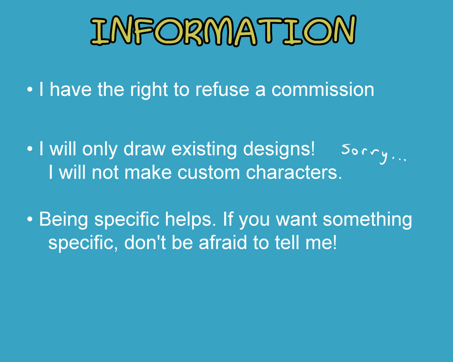 Hai! This is my commissions page. If you are interested in buying one, click these horrible little buttons.If you would like to see my normal carrd, click here!^ If you have any questions you can contact me on discord: @miawiathepia